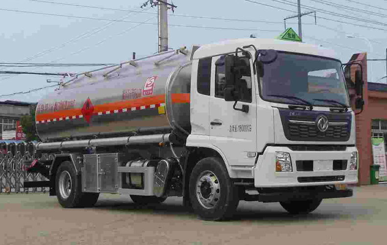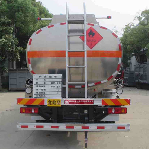 罐體有效容積:12.6立方米,危險貨物運輸車輛的類型為FL型,介質類項號:3;加油裝置下置時,罐體尺寸(長×長軸×短軸)(mm)為:5700×2000×1400;加油裝置上置時,罐體尺寸(長×長軸×短軸)(mm)為:4800×2160×1500;軸距/前懸/后懸對應關系為(mm):4700/1430/2370,4700/1400/2400,5000/1430/2070,5000/1400/2100;側、后防護裝置材料材質:Q235B,側、后防護均采用螺栓連接,后防護裝置斷面尺寸為(mm):80×150,后部防護離地高度:500mm;隨底盤選裝駕駛室,選裝箱門樣式,選裝加油裝置上置;安裝具有衛星定位功能的行駛記錄儀,排氣管前置,安裝前輪盤式制動器和限速裝置,限速80km/h,僅采用底盤子午線輪胎;ABS型號/生產廠家:3631010-C2000/東科克諾爾商用車制動系統(十堰)有限公司;該車后軸為采用空氣懸架.轉向輪安裝爆胎應急防護裝置.