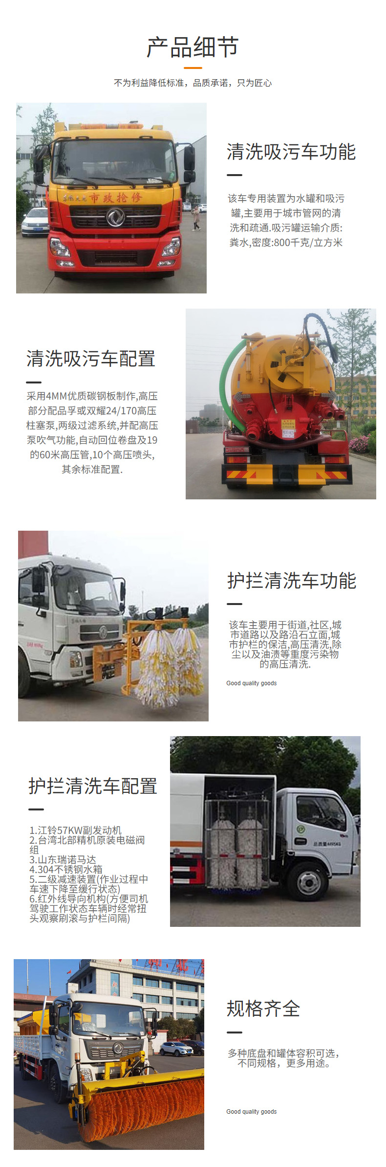 1、該車(chē)用于清洗吸污,主要專用裝置為真空泵和罐體。罐體尺寸為(直段長(zhǎng)×直徑)(mm):7100×2350,其中罐體前端為清水罐(直段長(zhǎng)3100mm);后端為污水罐(直段長(zhǎng)4000mm)。兩罐獨(dú)立,且不能同時(shí)滿載。清洗功能時(shí)用清水罐,吸污功能時(shí)用污水罐。污水罐總?cè)萘?4.74立方米,污水罐有效容積14.03立方米;清水罐總?cè)萘?1.79立方米,清水罐有效容積11.23立方米。2、側(cè)、后防護(hù)材料均為Q235,焊接。后防護(hù)截面尺寸200×50mm,下邊緣離地高500mm。選裝罐體頂部護(hù)欄樣式,選裝側(cè)面清洗管,選裝后罐口液壓開(kāi)啟樣式,選裝后部閥門(mén),選裝后部清洗管卷盤(pán)樣式,后部箭頭燈為選裝件。3、僅采用軸距(mm):1800+4600+1350,1800+4575+1400。隨底盤(pán)選裝半高頂駕駛室,可不選裝遮陽(yáng)罩,選裝晝間行駛燈,選裝油浴式空濾器,選裝保險(xiǎn)杠外觀,選裝高位保險(xiǎn)杠,選裝踏步,選裝前拖鉤,選裝駕駛室面罩,選裝車(chē)道偏離報(bào)警和車(chē)輛前向碰撞預(yù)警系統(tǒng),選裝四方位影像系統(tǒng);隨底盤(pán)選裝油箱及油箱安裝位置。ABS系統(tǒng)型號(hào)為446 004 6300,生產(chǎn)企業(yè)為威伯科汽車(chē)控制系統(tǒng)(中國(guó))有限公司。卸料方式為舉升后卸式。