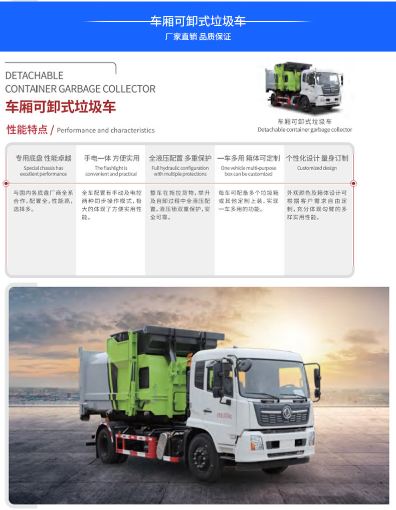 垃圾車價格_純電動垃圾車_東風天錦純電動車廂可卸式垃圾車★13908669111★產品名稱CSC5180ZXXDBEV型純電動車廂可卸式垃圾車,采用東風DFH1180BEV1底盤改裝而成,該車用于垃圾的收集清運,主要專用裝置為勾臂.整車美觀大方,全液壓配置多重保護能與大中型壓縮垃圾車或整體站無縫對接,提高經濟效益。更多垃圾車盡在:www.naoqd.com