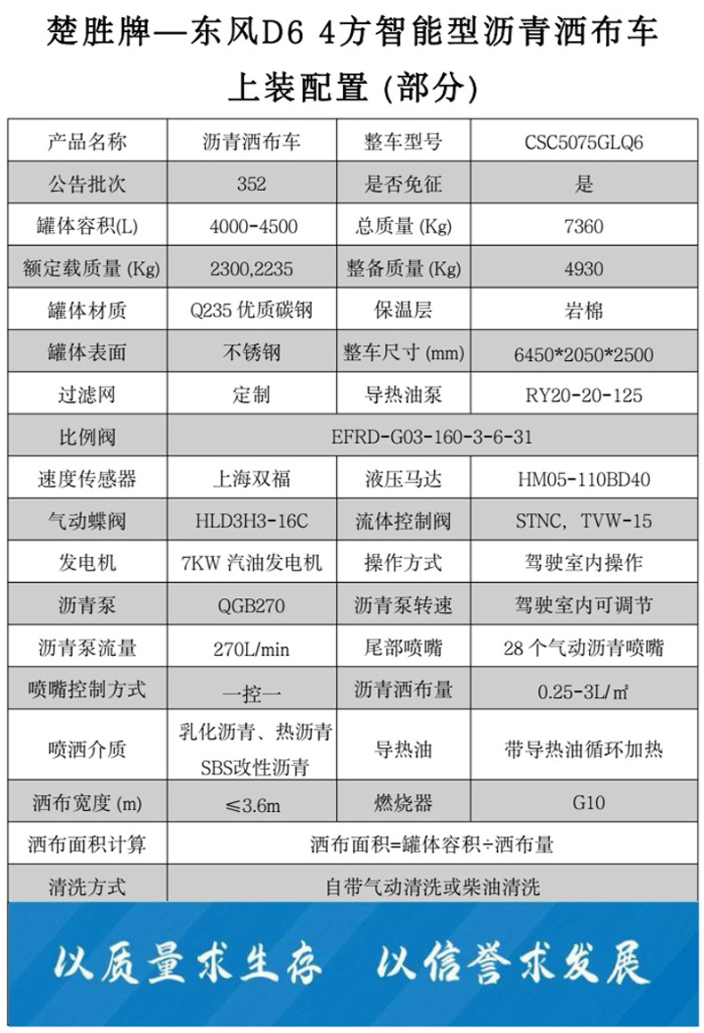 瀝青灑布車_東風D6智能型4方灑布車★13908669111★楚勝牌CSC5075GLQ6瀝青灑布車,采用東風EQ1075SJ3CDF底盤改裝而成,罐體材質為優質碳鋼板,巖板保溫層,罐體表面不銹鋼材質,該灑布車由汽車底盤、瀝青 罐體、瀝青泵送及噴灑系統、液壓系統、燃燒及導熱油加熱系統、控制系統、氣動系統、操作平臺構成。該車操作簡便,用于修筑高等級公路瀝青路面底層的透層油、防水層、粘結層的灑布。更多瀝青灑布車盡在:www.naoqd.com